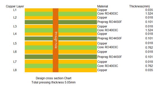 Diese Leiterplatte verfügt über eine 8-lagige Kupferkonfiguration, die speziell für Hochfrequenz- und Hochzuverlässigkeitsanwendungen entwickelt wurde. Ihre Materialzusammensetzung besteht hauptsächlich aus RO4003C Kernen, RO4450F Prepreg und hochwertiger Kupferfolie, wobei die RO4003C Kerne als die wichtigsten dielektrischen Schichten dienen, um eine hervorragende Signalintegrität zu gewährleisten, und das RO4450F Prepreg als Bindemittel zwischen den Schichten fungiert und in Verbindung mit der Kupferfolie eine stabile und leistungsstarke mehrlagige Struktur bildet.